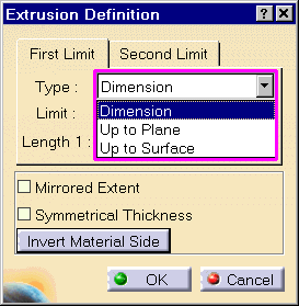 Creates an extrusion to a selected surface. The limiting surface must totally enclose the extrusion profile for the extrusion to stop. Again similar to the above options, modifications to the limiting surface reflect in the extrusion.